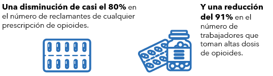 Una de las formas en que hemos tomado medidas es lanzando un programa de reducción de los opioides. En la última década, la prescripción y el abuso de opioides aumentaron, poniendo en peligro a los trabajadores lesionados. Así que pusimos en marcha un programa para alentar a los médicos a evitar o reducir la prescripción de opioides, y para educar a los trabajadores lesionados sobre los riesgos del uso de opioides para controlar el dolor.